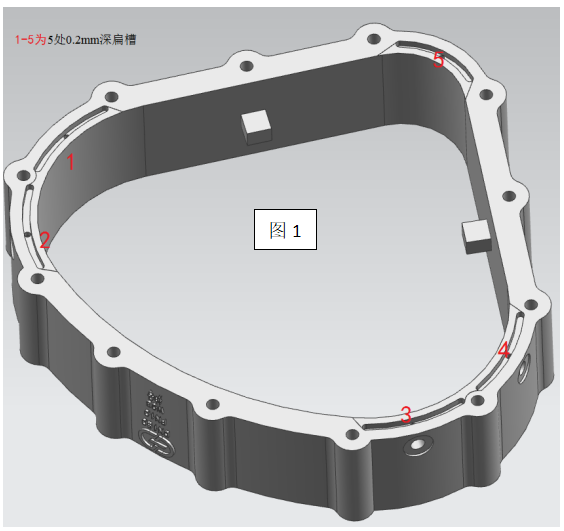 在磨盘阀阀圈周围容易积尘处加工5处0.2mm深扁槽, 扁槽根处加工深6mm储气槽 ,见图1: